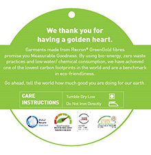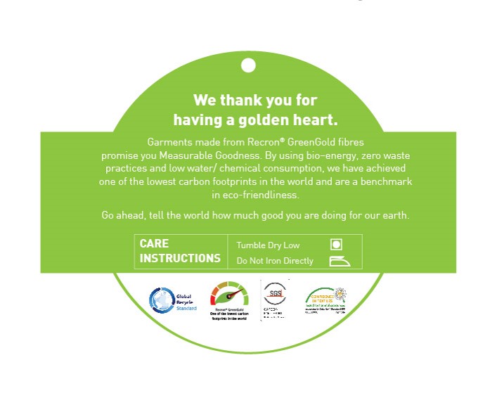 Please look for the Recron® GreenGold Tag and Label while buying fabric and garments.